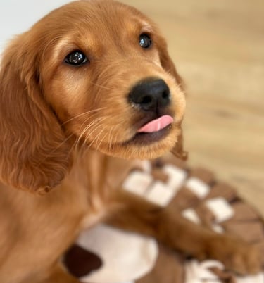 Golden Irish litter (Breeze x Maverick) puppies expected in January/February 2026 (waiting list currently closed - this may change should we have more puppies born than anticipated)