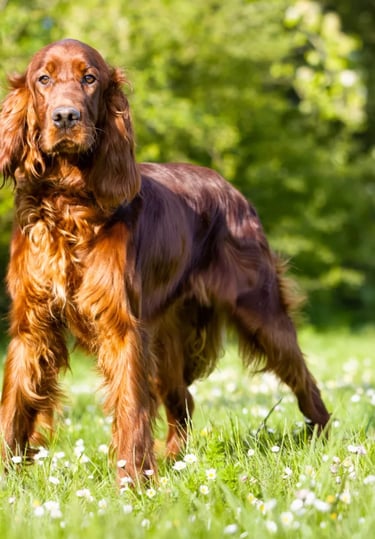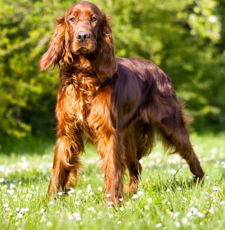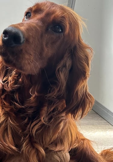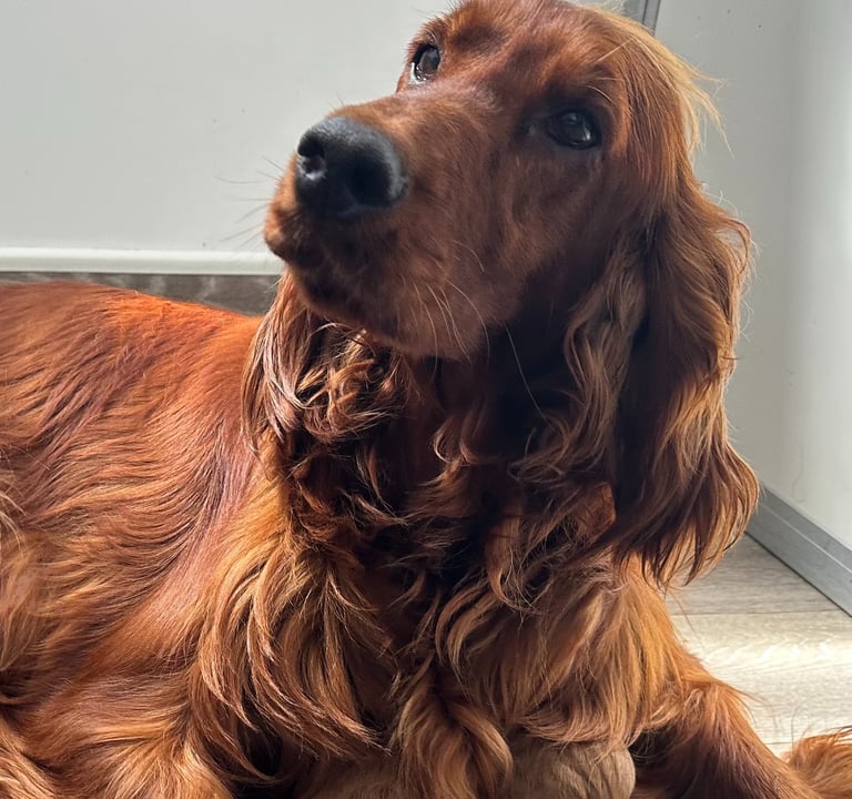 Meet Faun, our delightful KC registered Irish Setter. Faun is full of energy and boundless enthusiasm for life! She loves to play and run, making every outing she goes on an adventure. She is incredibly affectionate, always greeting you with a wagging tail and a nuzzle. Faun's intelligence shines through in everything she does, she is learning something new everyday and her friendly and loving nature always endears her to everyone she meets. Faun is fantastic with children and other pets, she has the most loving heart!