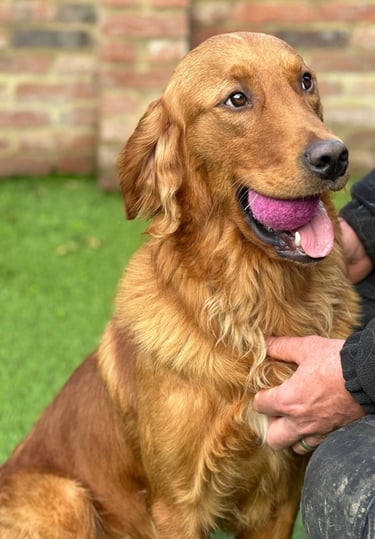 Maverick (KC registered Golden retriever). Mav is a stunning working line retriever. He has a super character and absolutely loves people. He is always so keen to learn as much as possible, and will do anything for his family. He is full of fun, has bundles of energy, often joins us on the park runs where everyone loves him! He has a real zest for life!